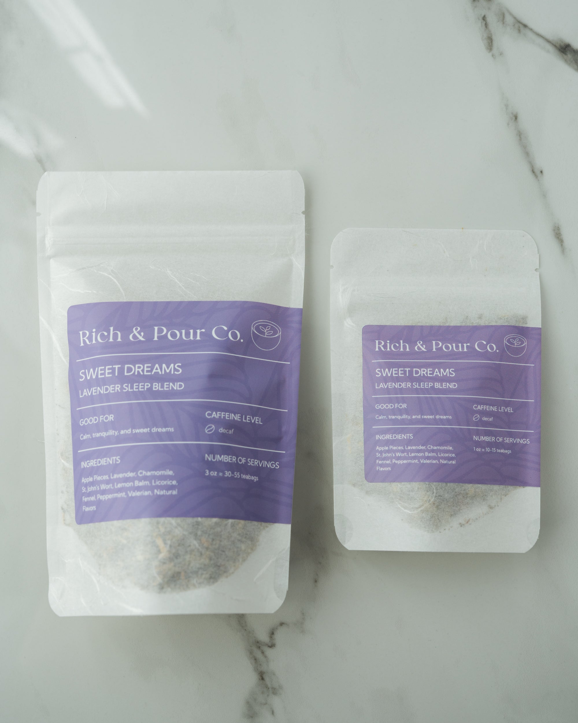 3 oz. net weight (equivalent to 30 - 45 teabags) packaged in biodegradable kraft.